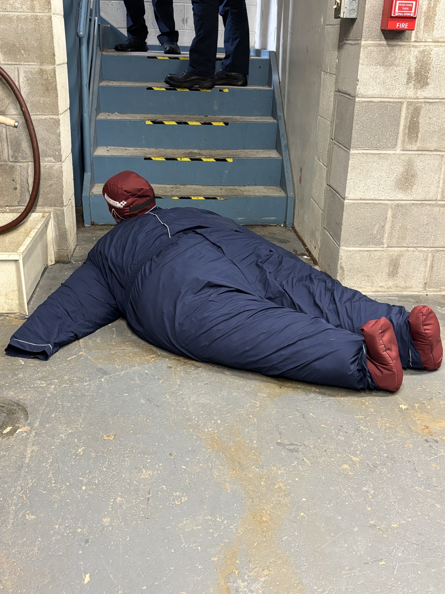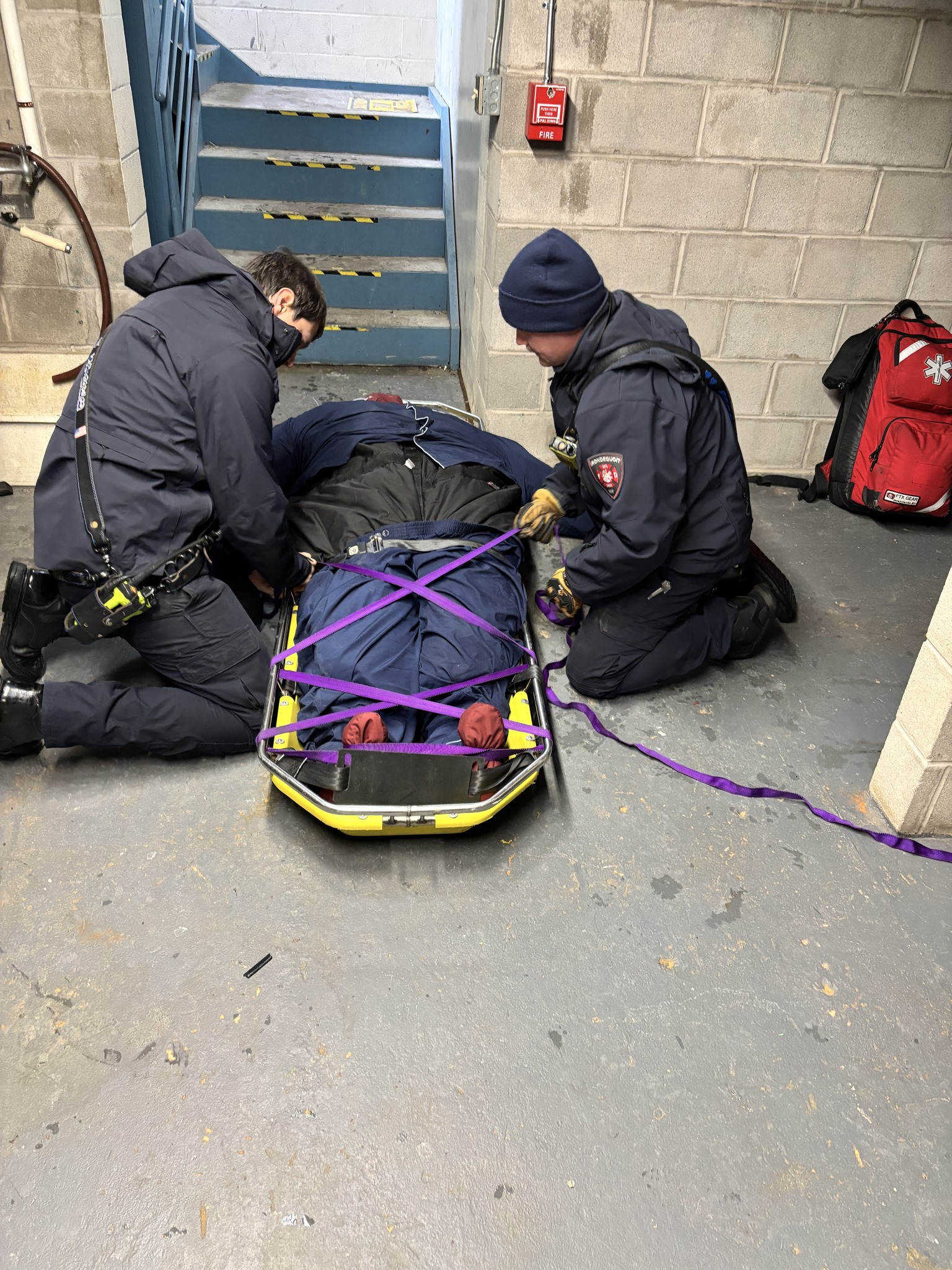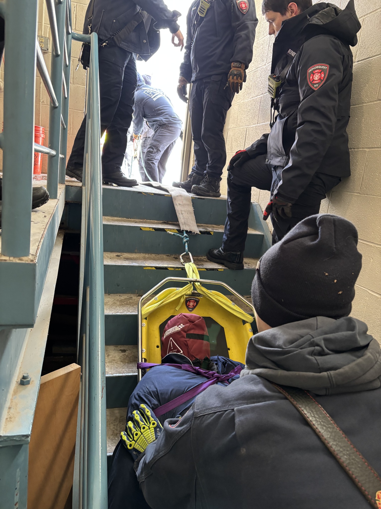 Rope training for our duty crews looked a little different this time. The Monroe County Fire Bureau recently purchased a bariatric manikin, now available for various training classes at the fire academy and for agencies throughout the county. While our crews regularly refresh their rope-rescue skills, the “load” is usually much lighter. In this scenario, companies were faced with extricating a patient who had fallen down a flight of stairs into a basement and required removal via rope system.