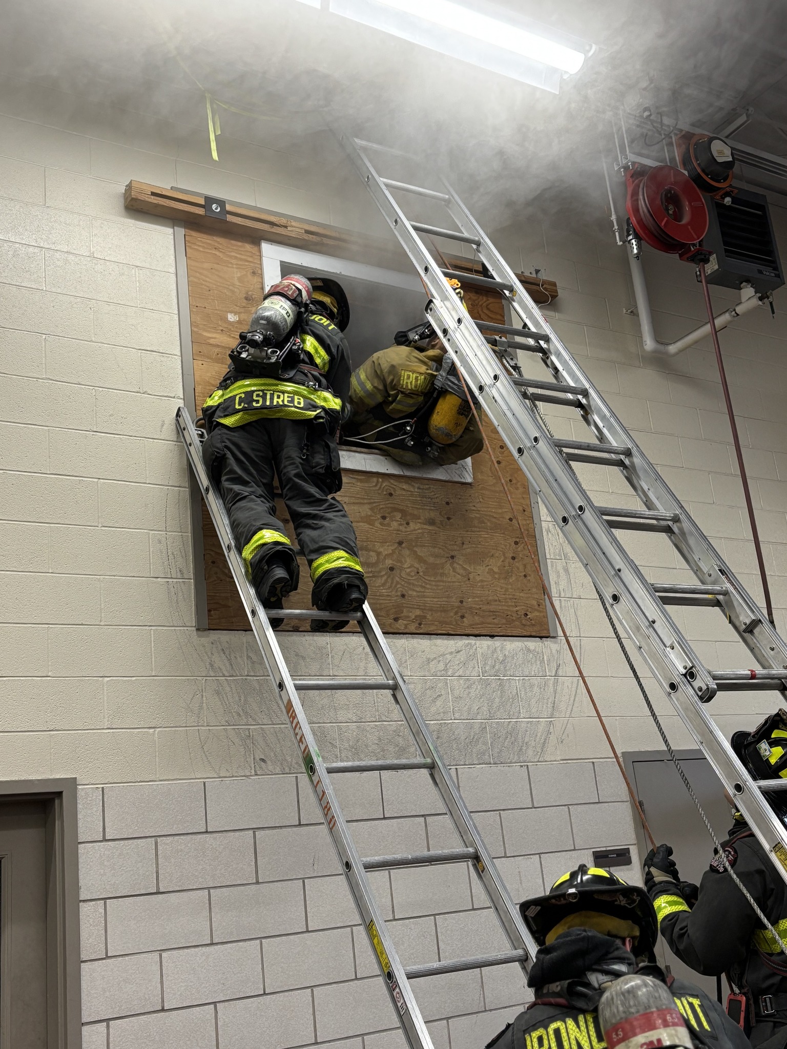 In the photos below, you’ll see firefighters using our “Syracuse bag” for firefighter extrication through a window using a high-point anchor, as well as several angles from our rope evolutions.