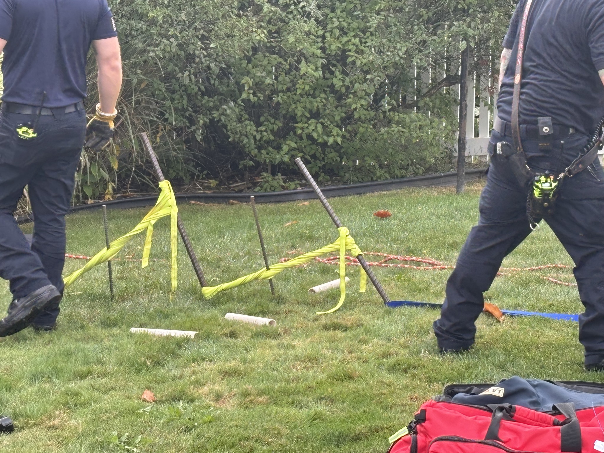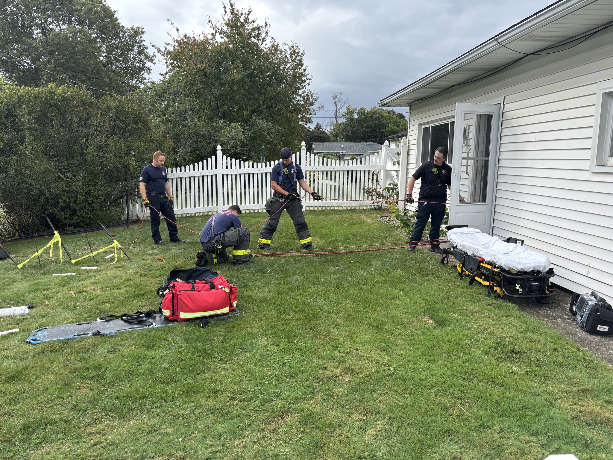 Fast-forward to this morning as I watched our Firefighters and Officers execute a technical and challenging rescue. Our members were originally requested for a serious medical emergency, involving a patient in the basement of a residence. Quickly, they ascertained that due to the weight of the patient and the physical constraints of the structure, a low-mid level rope system would be needed to extract the patient safely, while medical care ensued. Further complicating the rescue was the lack of room in removing the patient from the basement to the exterior of the house, in addition to the lack an “anchor” for our members to secure the rope system to. Anchors are often fixed objects (trees, vehicles, telephone poles) with the ability to carry the load of the rescue system and any rescuers working on rope. Due to the unique location, our members quickly created an Anchor System using a picket anchor system(a common rope rescue anchor). Over a 20 minute time frame, firefighters and officers established the anchor, built a rope system, hauled the victim out of the basement and continued delivering medical care the entire time. 15 firefighters and officers from Irondequoit Fire District and St. Paul Boulevard Fire Association along with Paramedics/EMT’s from Irondequoit Ambulance, Inc. and with assistance from Irondequoit Police Department safely and effectively delivered the patient to be transported to a local hospital.